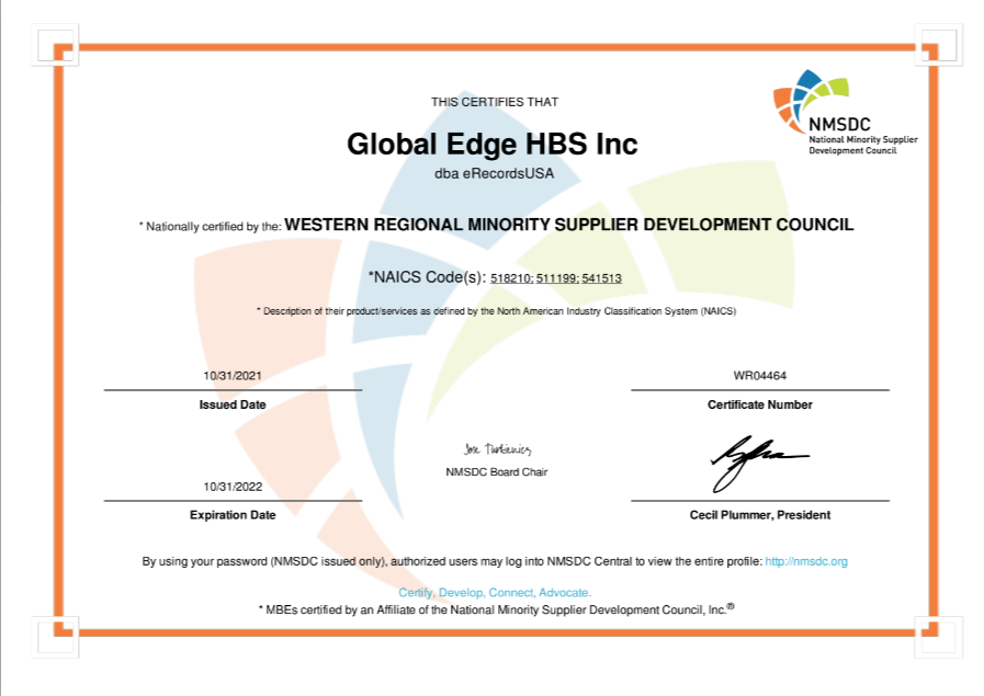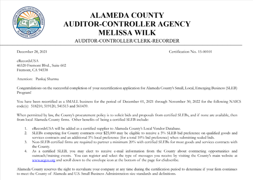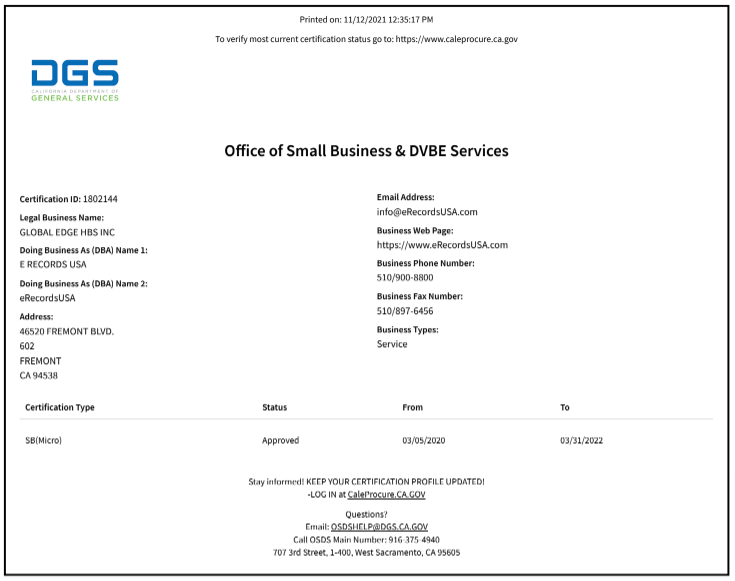 This certification supports businesses owned by disabled veterans and small businesses, ensuring they receive opportunities for government contracts. It highlights eRecordsUSA’s commitment to diversity and government project eligibility.